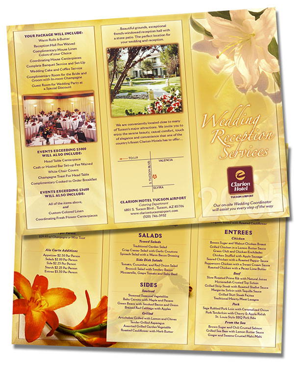 a wedding brochure for a local hotel. the background conisists of a dozen+ layers of flowers, borders, and fades to get that warm glow.